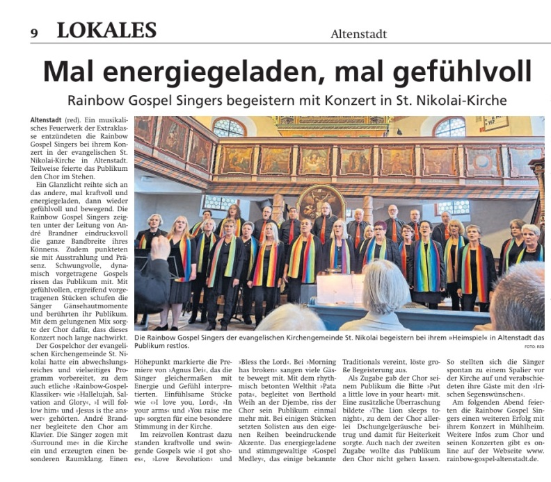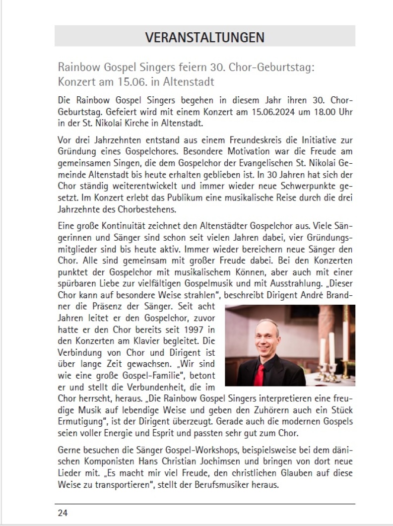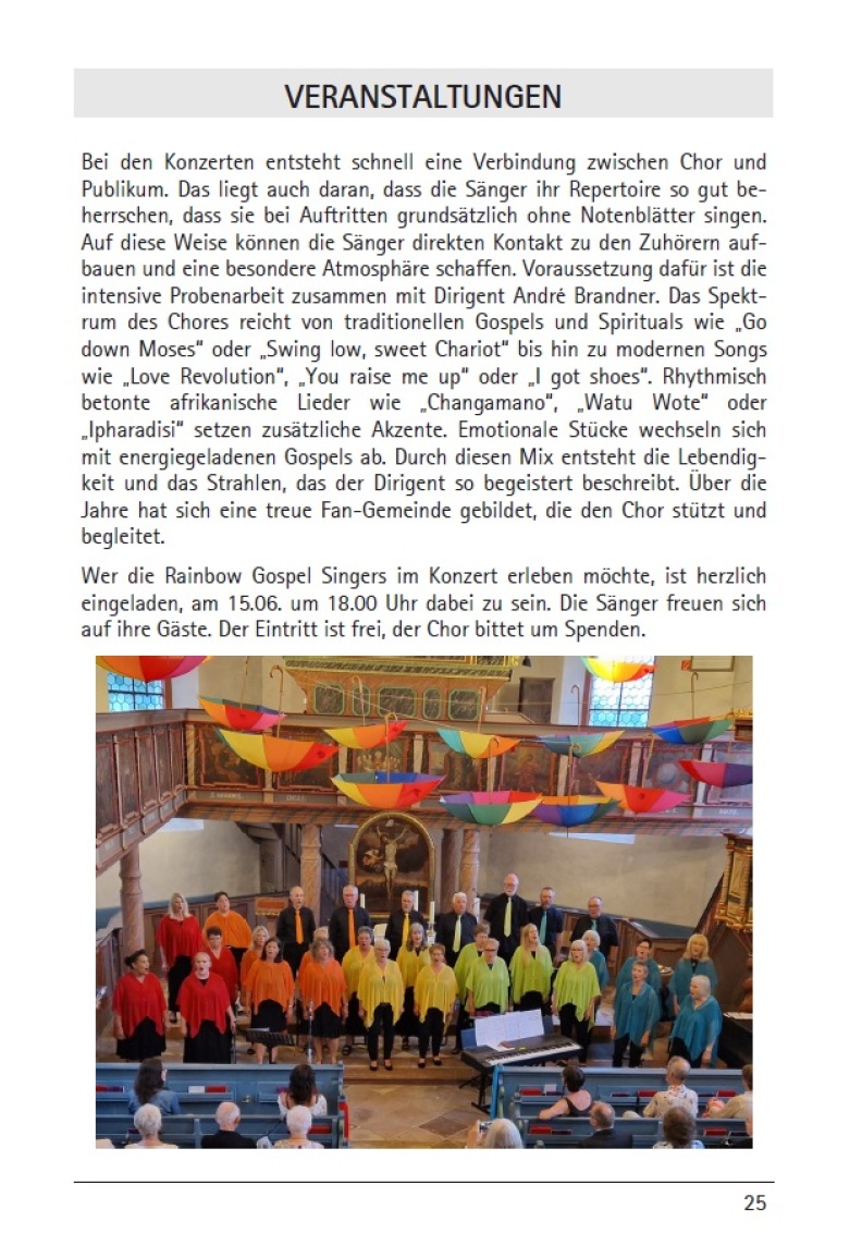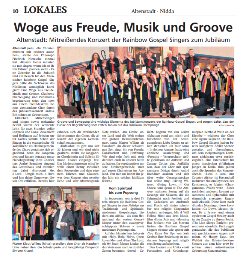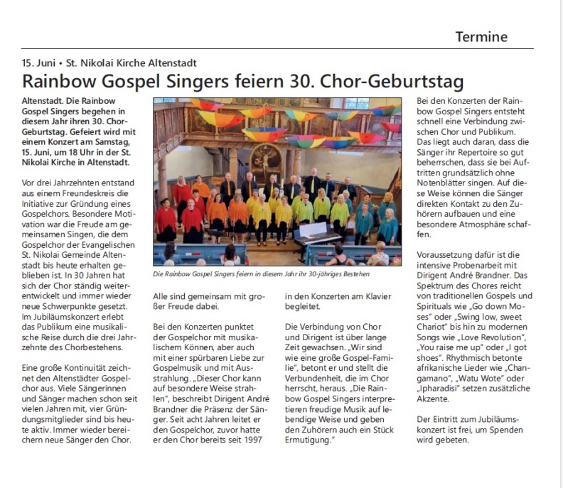 Der Gemeindebrief der St. Nikolai-Gemeinde Altenstadt, zu der die Rainbow Gospel Singers gehören, hat dem Jubiläumskonzert zwei Seiten gewidmet.
